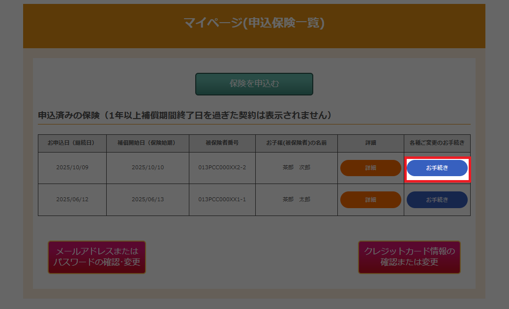 申込保険一覧から契約を選択し、お手続きボタンをクリックします。