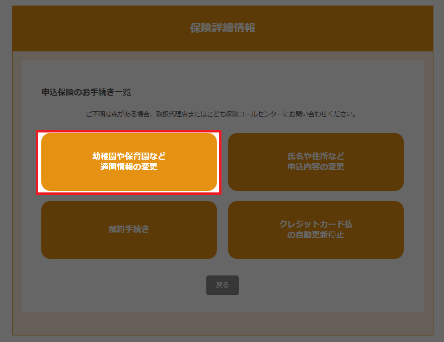 お手続きメニュー内の幼稚園や保育園など通園情報の変更ボタンをクリックします。