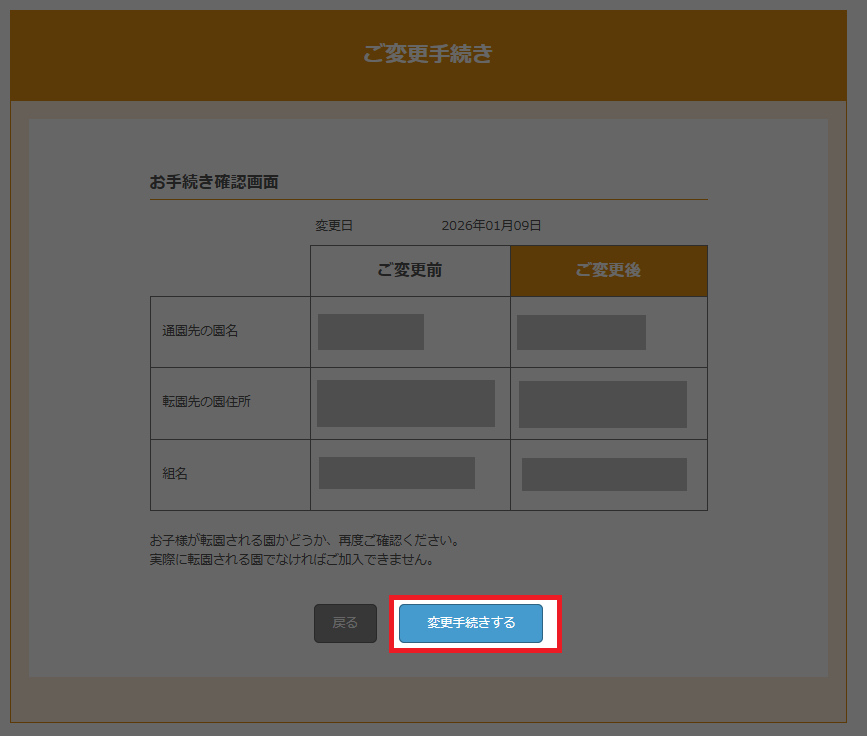 ご変更前とご変更後の内容が表示されますので、入力内容を確認し、変更手続きするボタンをクリックします。