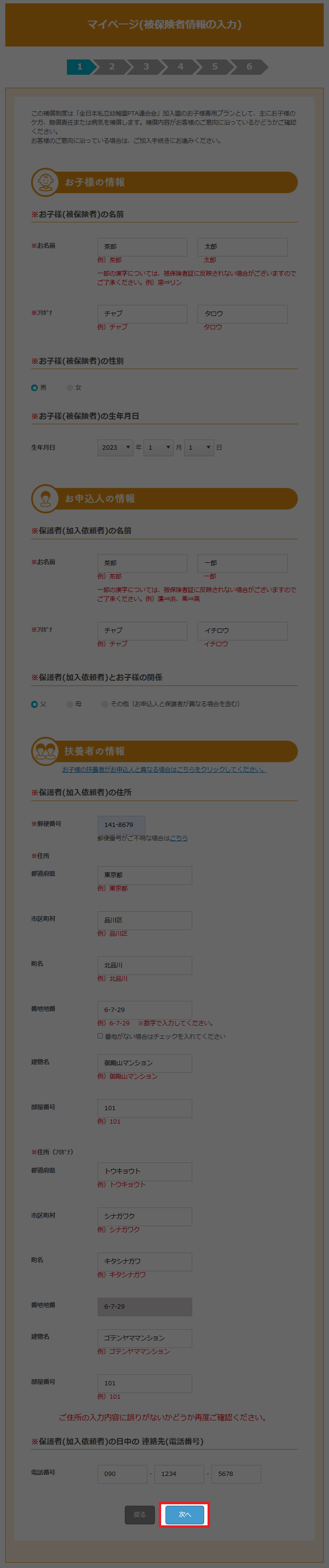 画面に表示される申込に必要なお子様の情報、お申込み人の情報等を入力していきます。