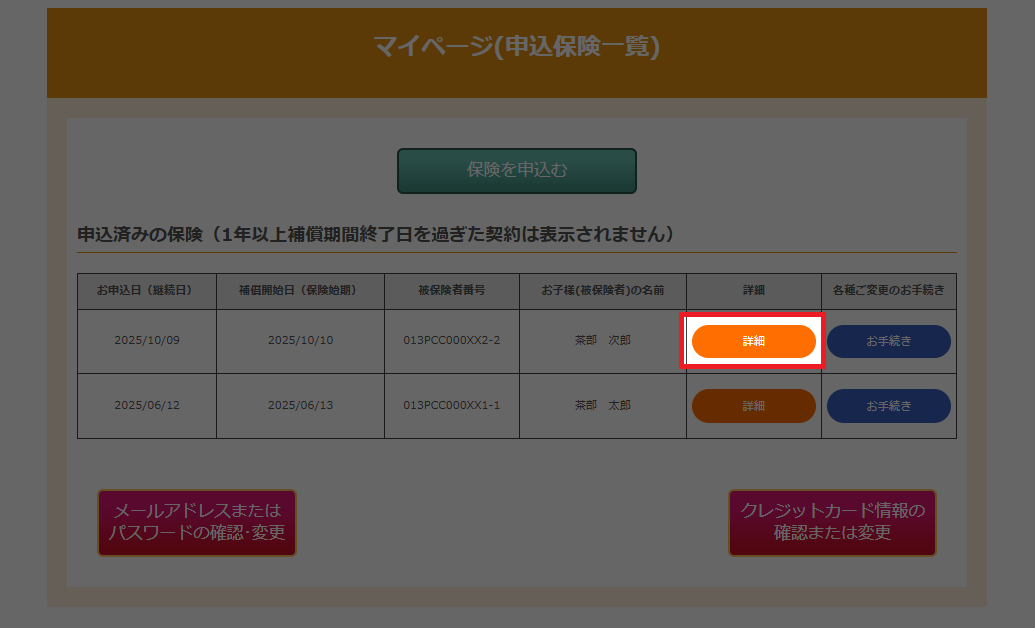 申込保険一覧から契約を選択し、詳細ボタンをクリックします。