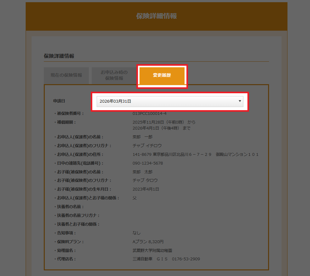 保険詳細情報の上部にある変更履歴タブをクリックします。