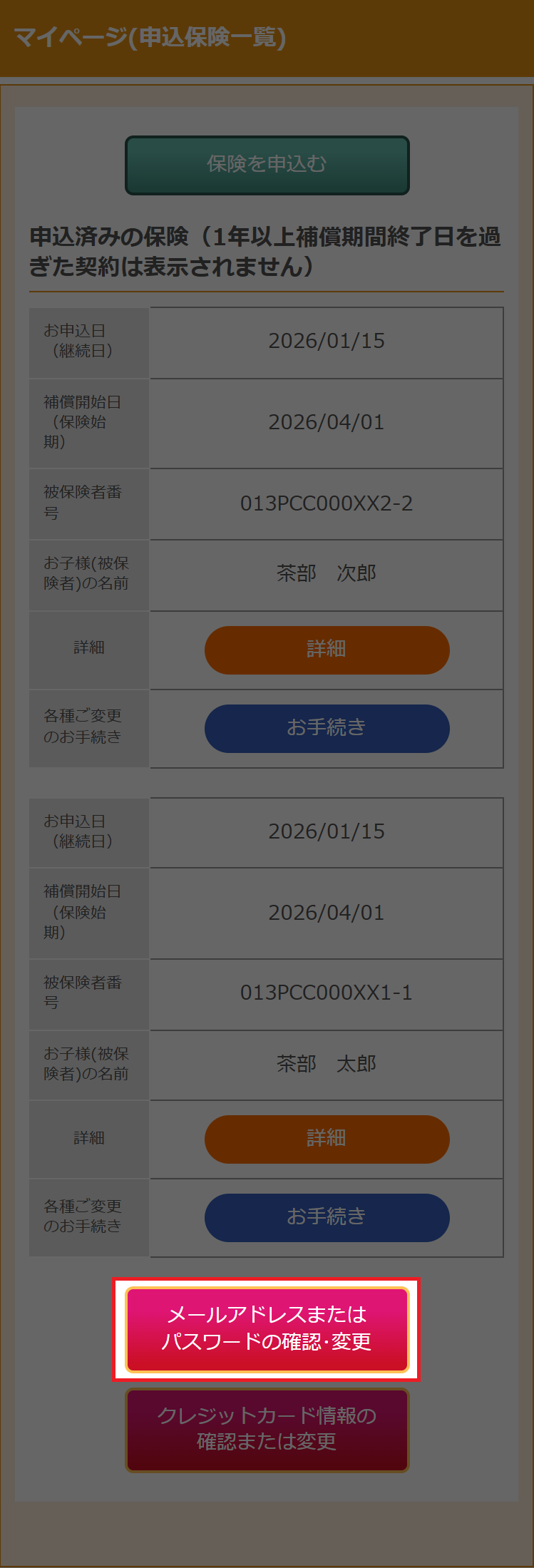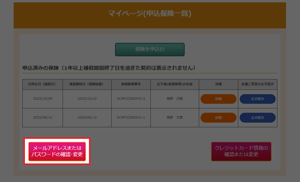 ログイン後、マイページ(申込保険一覧)画面の下より、メールアドレスまたパスワードの確認・変更ボタンをクリックします。